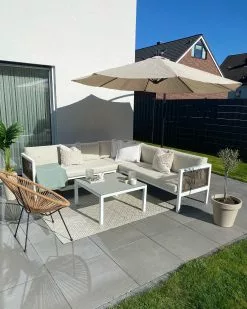 Anna ulkotilallesi uusi ilme tällä 4-istuttavalla modulaarisella ulkosohvaryhmällä. Vankasta valkoiseksi jauhemaalatusta alumiinista valmistettujen runkojen ansiosta kalusteet näyttävät hyviltä vuosien ajan. Selkänojan tyylikäs, ruskean värinen punos tuo sohvaan välimerellistä tunnelmaa. Kalusteiden neutraalit värit sulautuvat täydellisesti useisiin erityylisiin puutarhoihin tai terasseille. Viimeistele sohva persoonallisilla yksityiskohdilla, kuten koristetyynyillä tai huovilla. Setin viimeistelevät paksut, kermanvalkoiset pehmusteet sekä karkaistulla lasitasolla varusteltu leveä sohvapöytä.