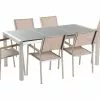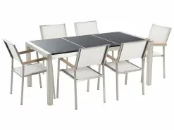 Poikkeuksellinen puutarhakalustesetti, joka luo ainutlaatuisen ilmeen mihin tahansa puutarhaan. Kalusteiden rungot on valmistettu vankasta ja kestävästä ruostumattomasta teräksestä, joka takaa, että setti pysyy upeana pitkään. Hopea runko korostaa mustaa kiillotettua graniittitasoa kauniisti. Pinottavien tuolien selkänojat ja istuinosat ovat UV-kestävää valkoista polyesteriä, joka täydentää pöytää täydellisesti. Säänkestävien materiaalien yhdistelmä antaa ulkoruokailuryhmälle modernin ilmeen. Setti tarjoaa tilaa jopa 6 hengelle, jonka ansiosta se on täydellinen lisä kesän puutarhajuhliin.