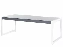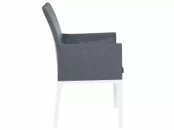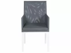 Tämä moderni 7 osasta koostuva puutarhakalustesetti on täydellinen paikka perheen yhteisille aterioille. Katseita keräävä muotoilu ja yksinkertaiset muodot ovat tämän korkealaatuisen kalustesetin kohokohtia. Kestävällä, harmaan värisellä polyesterillä verhoillut tuolit on täytetty miellyttävän tuntuisella vaahtomuovilla. Materiaalit ovat nopeasti kuivuvia ja kestävät satunnaisia sadekuuroja. Pöytälevy on verhoiltu polyesterillä, jonka päällä sijaitseva karkaistu lasitaso tarjoaa paljon tilaa erilaisille naposteltaville ja juomille. Valkoiseksi jauhemaalatut alumiinirungot takaavat vakauden.