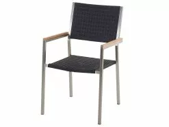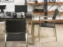 Poikkeuksellinen puutarhakalustesetti, joka luo ainutlaatuisen ilmeen mihin tahansa puutarhaan. Kalusteiden rungot on valmistettu vankasta ja kestävästä ruostumattomasta teräksestä, joka takaa, että setti pysyy upeana pitkään. Hopea runko korostaa mustaa karkaistua lasitasoa kauniisti. Pinottavien tuolien selkänojat ja istuinosat ovat UV-kestävää mustaa polyrottinkia, joka täydentää pöytää täydellisesti. Säänkestävien materiaalien yhdistelmä antaa ulkoruokailuryhmälle modernin ilmeen. Setti tarjoaa tilaa jopa 6 hengelle, jonka ansiosta se on täydellinen lisä kesän puutarhajuhliin.