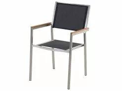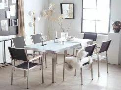 Poikkeuksellinen puutarhakalustesetti, joka luo ainutlaatuisen ilmeen mihin tahansa puutarhaan. Kalusteiden rungot on valmistettu vankasta ja kestävästä ruostumattomasta teräksestä, joka takaa, että setti pysyy upeana pitkään. Hopea runko korostaa valkoista karkaistua lasitasoa kauniisti. Pinottavien tuolien selkänojat ja istuinosat ovat UV-kestävää mustaa polyesteriä, joka täydentää pöytää täydellisesti. Säänkestävien materiaalien yhdistelmä antaa ulkoruokailuryhmälle modernin ilmeen. Setti tarjoaa tilaa jopa 6 hengelle, jonka ansiosta se on täydellinen lisä kesän puutarhajuhliin.