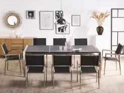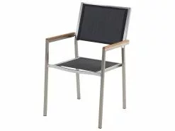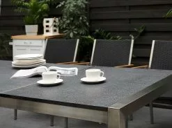 Poikkeuksellinen puutarhakalustesetti, joka luo ainutlaatuisen ilmeen mihin tahansa puutarhaan. Kalusteiden rungot on valmistettu vankasta ja kestävästä ruostumattomasta teräksestä, joka takaa, että setti pysyy upeana pitkään. Hopea runko korostaa mustaa poltettua graniittitasoa kauniisti. Pinottavien tuolien selkänojat ja istuinosat ovat UV-kestävää mustaa polyesteriä, joka täydentää pöytää täydellisesti. Säänkestävien materiaalien yhdistelmä antaa ulkoruokailuryhmälle modernin ilmeen. Setti tarjoaa tilaa jopa 8 hengelle, jonka ansiosta se on täydellinen lisä kesän puutarhajuhliin.