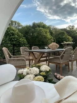 Tämä ulkoruokailuryhmä tuo tyyliä mihin tahansa ulkotilaan. Tilavalla pöytälevyllä varustettu puutarhapöytä ja mukana tulevat tuolit tarjoavat tilaa jopa 6 hengelle. Kaikki osat on valmistettu sääolosuhteita ja kosteutta kestävistä materiaaleista, jotka ovat helppohoitoisia. Pöytälevy on valmistettu kuitusementistä. Tuolien selkänojat on valmistettu rottinkia muistuttavasta muovipunoksesta. Kalusteita korostavat akasiapuusta valmistetut jalat. Mukana tulevat pehmusteet tarjoavat lisämukavuuden. Muotoilunsa ansiosta tämä kalustesetti sopii moniin ulkotiloihin, moderneista perinteisiin.