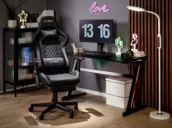 Tämä keinonahkaverhoiltu tuoli on täydellinen istuin pitkiin pelihetkiin ja se on muotoiltu erityisesti pitkäkestoiseen istumiseen. Lukuisilla korkeuden ja käsinojien asennon säätömahdollisuuksien ansiosta voit mukauttaa tuolin tarpeidesi mukaisesti. Lisätty pehmuste niskan ja selän alueella tukee selkärankaa. Ulosvedettävän jalkatuen ansiosta voit venyttää jalkojasi ja 5 pyörää mahdollistavat tasaisen rullauksen.
