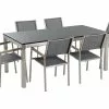 Tämä kahden puutarhatuolin setti on täydellinen valinta puutarhaan tai terassille. Tuolien runko on valmistettu kestävästä ruostumattomasta teräksestä, joka takaa vakauden. Muovisella puujäljitelmällä päällystetyt käsinojat suojaavat käsivarsiasi kylmältä metallilta. Istuin ja selkänoja on verhoiltu harmaalla tekstiilikuidulla, joka takaa maksimaalisen istumamukavuuden. Yhdistä puutarhatuolit yhteensopivan puutarhapöydän kanssa luodaksesi tyylikkään kokonaisuuden, jonka ääressä voit nauttia yhteisistä hetkistä perheen ja ystävien kesken.