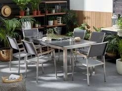Tämä kahden puutarhatuolin setti on täydellinen valinta puutarhaan tai terassille. Tuolien runko on valmistettu kestävästä ruostumattomasta teräksestä, joka takaa vakauden. Muovisella puujäljitelmällä päällystetyt käsinojat suojaavat käsivarsiasi kylmältä metallilta. Istuin ja selkänoja on verhoiltu harmaalla tekstiilikuidulla, joka takaa maksimaalisen istumamukavuuden. Yhdistä puutarhatuolit yhteensopivan puutarhapöydän kanssa luodaksesi tyylikkään kokonaisuuden, jonka ääressä voit nauttia yhteisistä hetkistä perheen ja ystävien kesken.