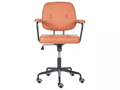 Piristä kotitoimistoasi tällä käytännöllisellä työtuolilla. Kestävällä keinonahalla verhoiltu toimistotuoli on viimeistelty tyylikkäällä nappituftauksella, pehmustetuilla käsinojilla sekä paksulla istuimella, joka takaa istumamukavuuden. Kaasunostimella varustetun tuolin korkeus on säädettävissä tarpeidesi mukaan, kun taas 360° kääntyvyys ja pehmeästi rullaavat pyörät mahdollistavat helpon liikkumisen. Kromattu rautarunko ja -jalusta tekevät työtuolista erittäin vakaan. Retrovaikutteisen muotoilunsa ansiosta se näyttää erityisen hyvältä niin perinteisissä kuin moderneissakin sisustuksissa.