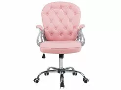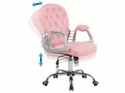Tämä ylellinen tuoli on yhdistelmä nykyaikaisuutta ja vintage-tyyliä. Kestävällä keinonahalla verhoillussa tuolissa on napitettu selkänoja, jossa on timantinmuotoiset tikkaukset elegantin viimeistelyn takaamiseksi. Kaarevat pehmustettu käsinojat tarjoavat mukavuutta ja täydentävät vaaleanpunaista verhoilua. Sisäänrakennettu kallistus- ja 360° kääntömekanismi sekä kaasunostin mahdollistavat täydellisen säädön, joka on räätälöity kehosi mukaan. Tuoli on monipuolinen vaihtoehto erilaisiin toimistoympäristöihin.