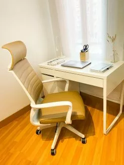 Tee kotitoimistostasi entistä mukavampi tällä korkeaselkäisellä työtuolilla. Se sopii loistavasti moderniin tai minimalistiseen sisustukseen. Selkänoja on verhoiltu kestävällä ja miellyttävän tuntuisella keinonahalla. Kallistusmekanismi ja säädettävä korkeus varmistavat, että tuoli tarjoaa mukavuutta pitkien työtuntien tai pelaamisen aikana. Nailonpyörät rullaavat pehmeästi lattiaa vasten, joten ne eivät jätä naarmuja. Tukevan metallirungon ansiosta tuoli takaa vaakaan ja pitkäikäisen käytön.