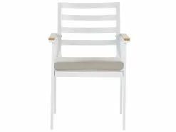 Nauti illallisesta ulkona näissä klassisissa puutarhatuoleissa istuen. Tuolien runko on valmistettu kestävästä, valkoiseksi jauhemaalatusta alumiinista. Klassinen säleselkänoja antaa puutarhatuoleille skandinaavisen vaikutelman, joten ne sopivat monenlaisiin moderneihin ja perinteisiin sisustuksiin. Muovisella puujäljitelmällä päällystetyt käsinojat suojaavat kylmältä alumiinilta ja tuoden runkoon kontrastia. Mukana tulevat paksut beiget istuintyynyt takaavat istumamukavuuden, täydentäen tuolien ulkonäköä täydellisesti. Luo upea kokonaisuus yhdistämällä tuolit puutarhapöydän kanssa.